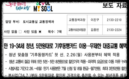 서울시에서 최초로 시작한 제도로, 내일부터는 만 19세에서 34세의 청년층이 더 싼 가격인 월 55,000원의 무제한으로 대중 교통을 이용할 수 있는 청년 맞춤형 기후 동행 카드가 출시된다.
